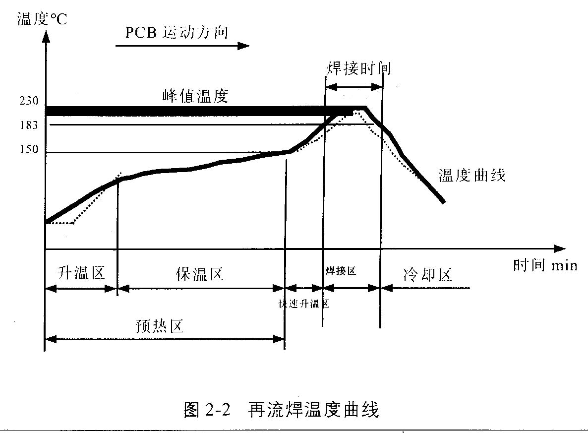 從溫度曲線(見圖2-2)分析再流焊的原理:當(dāng)PCB進(jìn)入升溫區(qū)(干燥區(qū))時(shí),焊膏中的溶劑、氣體蒸發(fā)掉,同時(shí),焊膏中的助焊劑潤(rùn)濕焊盤、元器件端頭和引腳,焊膏軟化、塌落、覆蓋了焊盤、元器件端頭和引腳與氧氣隔離→PCB進(jìn)入保溫區(qū)時(shí),PCB和元器件得到充分的預(yù)熱,以防PCB突然進(jìn)入焊接高溫區(qū)而損壞PCB和元器件→當(dāng)PCB進(jìn)入焊接區(qū)時(shí),溫度迅速上升使焊膏達(dá)到熔化狀態(tài),液態(tài)焊錫對(duì)PCB的焊盤、元器件端頭和引腳潤(rùn)濕、擴(kuò)散、漫流或回流混合形成焊錫接點(diǎn)→PCB進(jìn)入冷卻區(qū),使焊點(diǎn)凝固。此時(shí)完成了再流焊。