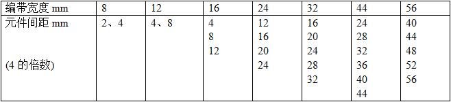 紙帶和塑料帶的孔距為4mm,(1.0*0.5mm以下的小元件為2mm),元件間距 4m的倍數(shù),根據(jù)元器件的長度而定。編帶的尺寸標準見表4-4。