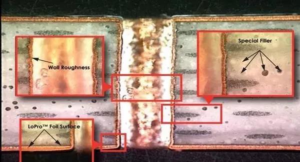 由于微球的存在,電路加工結(jié)構(gòu)的外觀——例如從一個導(dǎo)電層到另一個導(dǎo)電層的金屬化過孔(PTH)——看起來比沒有采用這種特殊介質(zhì)填料的傳統(tǒng)的線路板材料,制作形成的金屬化過孔要更加粗糙??赡芸雌饋硎沁@樣的,又或者是有什么其他的擔(dān)憂,畢竟因為采用中空微球填料的線路板在做金屬化過孔時孔壁非常的粗糙。但一系列的研究表明,無論是在射頻頻率下,還是對5G無線網(wǎng)絡(luò)的毫米波頻率下,中空微球填料對金屬化過孔的影響純粹是表面外觀上的,它并不會影響電路的性能或金屬化過孔的可靠性。