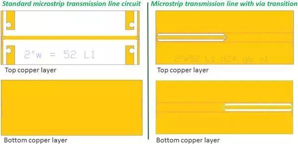 圖3. 這些電路是用于評估金屬化過孔孔壁表面粗糙度對高頻下RF性能的影響的電路設(shè)計,左圖是標(biāo)準(zhǔn)的微帶傳輸線,右邊是具有金屬化過孔的微帶線電路。