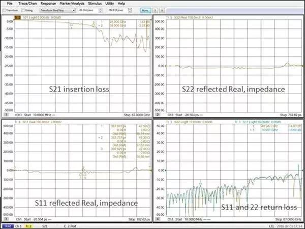 圖4. 這是網(wǎng)絡(luò)分析儀測試得到的不同電路且具有不同壁表面紋理的金屬化過孔的S參數(shù)的示例,分別包括頻域和時域。