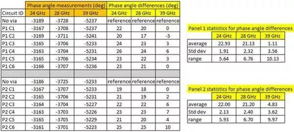 圖5中的電路ID可以顯示電路來自哪個12×18英寸的大板,以及該板上的電路ID編號。例如,P1 C4來自板1,電路編號為4號。電路彼此之間互相遠(yuǎn)離并均勻地分別在12×18英寸的板上,以保持一致性。某些變化是可以事先預(yù)料到的,因為它們對相位角的差異非常敏感。某些變化是由于PCB制造過程而造成的,而不是金屬化過孔壁粗糙度的原因,包括導(dǎo)體寬度的變化,鍍銅厚度的變化和鉆孔質(zhì)量的變化。此外,金屬化過孔周圍的縫隙由于PCB的正常制造公差也會出現(xiàn)一些變化。同樣,每個板上的微小材料變化,如Dk值的微小變化,也可能導(dǎo)致相位的變化??紤]到圖5所示的測試值,在39 GHz時相位數(shù)據(jù)的可重復(fù)性標(biāo)準(zhǔn)差小于±1.2度,這是非常好的。