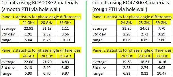 圖6.比較了在三個關(guān)鍵的5G頻率下,不同線路板上制作的微帶傳輸線電路的相位角差異統(tǒng)計情況。 左邊的數(shù)據(jù)是光滑的金屬化過孔孔壁表面電路的測試結(jié)果,而右邊的數(shù)據(jù)是粗糙的金屬化過孔孔壁表面的測試結(jié)果。
